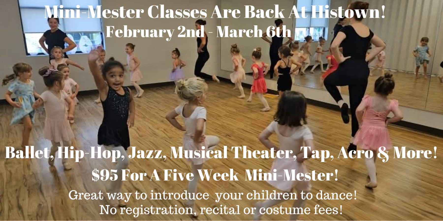 We’re excited to be able to offer over twenty different classes as part of what we call a “Mini-Mester” that runs for five weeks, February 2nd through March 6th! This includes ballet, jazz, hip-hop, contemporary, Acro, musical theater and even some acting classes! It’s a great way to introduce your child to other fun genres of dance. Students participating in any of our Mini-Mester classes are not expected to perform in any of our recitals (but can certainly do so if they decide to continue with classes after the Mini-Mester is over) so there are no costume fees or recital fees involved. Click on this link to see all the classes offered.